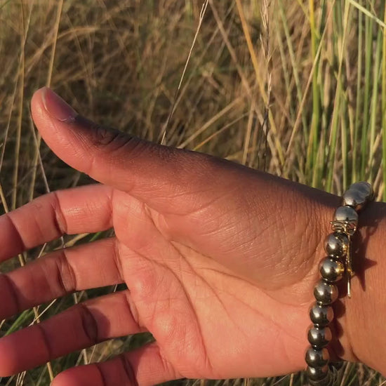 Das Armband besteht aus dem Naturstein Hämatit, der in einem aufwändigen Verfahren mit einem glänzenden Goldton überzogen wurde.